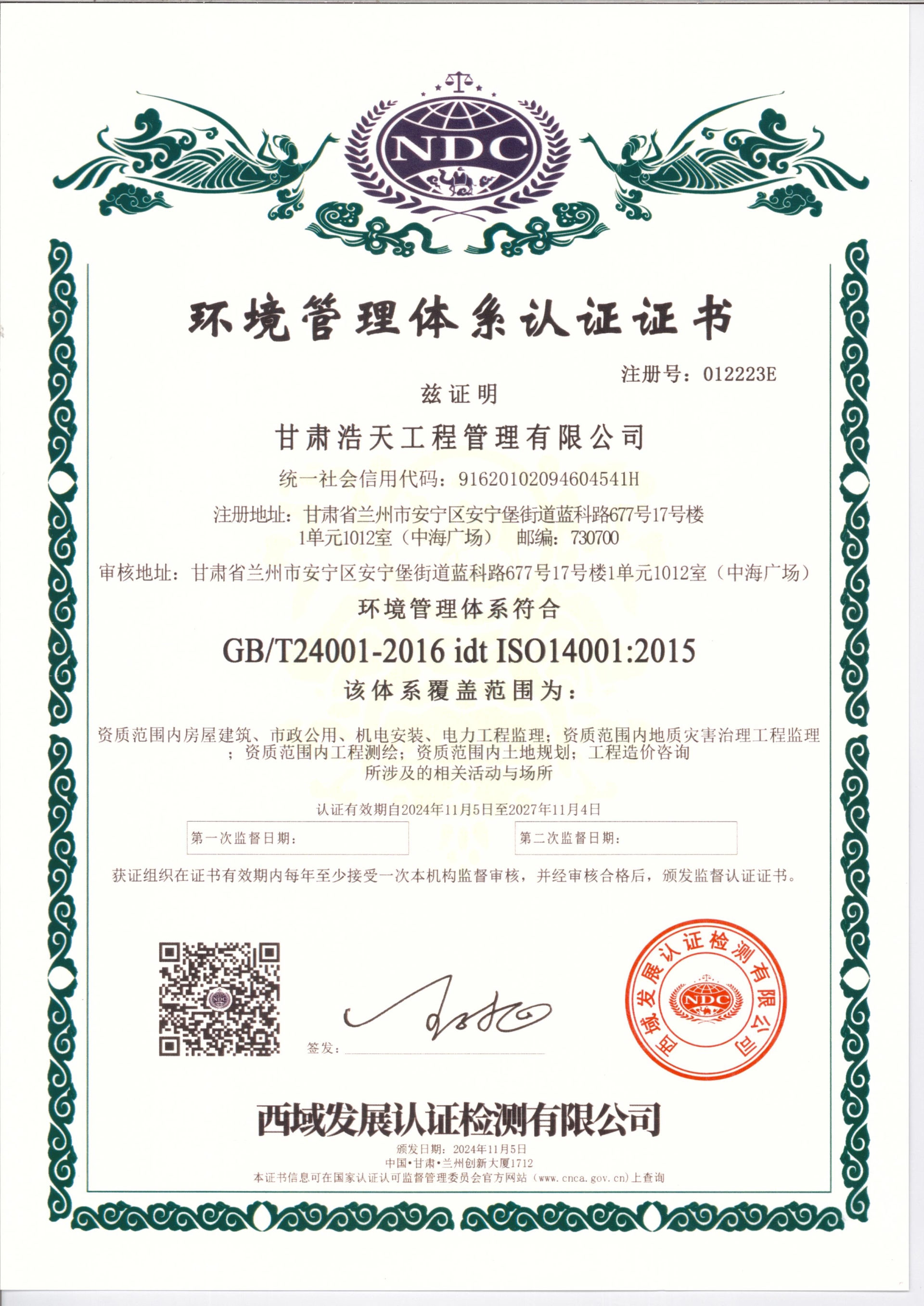 環(huán)境管理體系認證證書